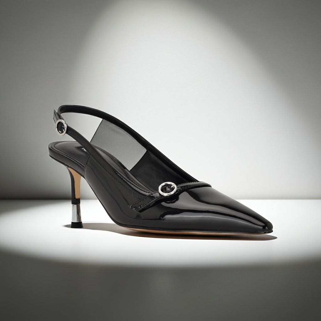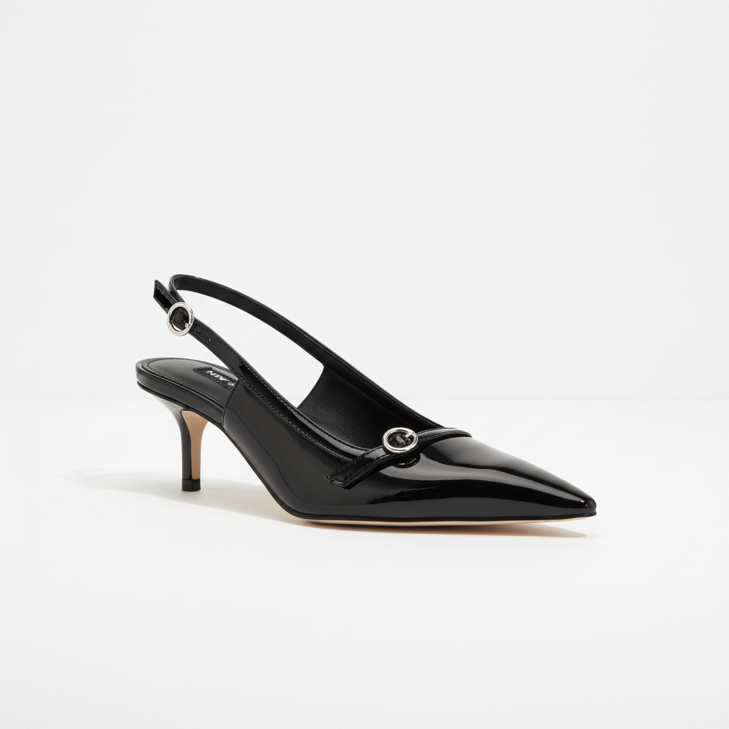 These elegant heels feature a sleek pointed toe and a glossy patent finish that adds a refined edge to any outfit. Designed with an adjustable slingback strap and a secure buckle closure, they offer a customized fit that stays comfortable all day long.